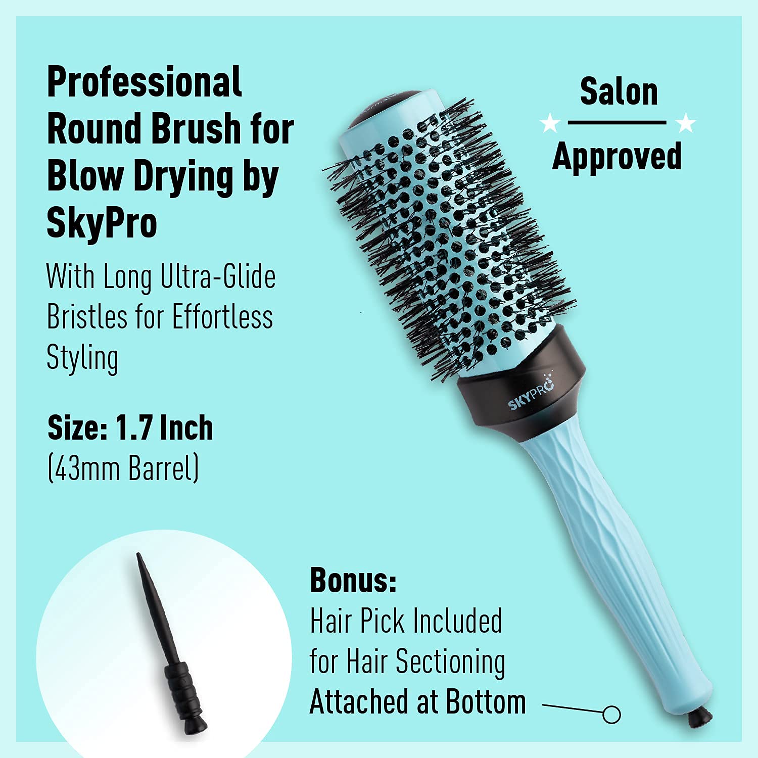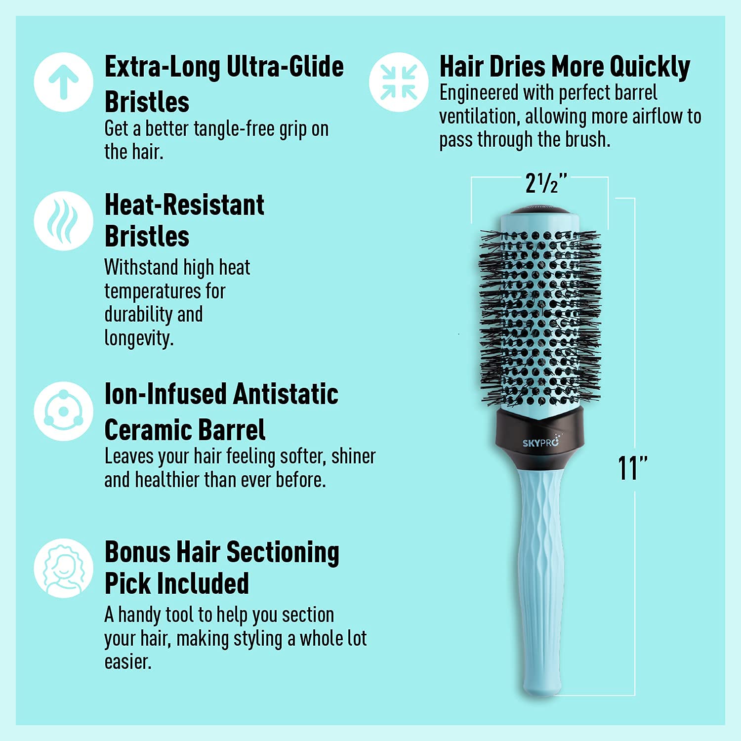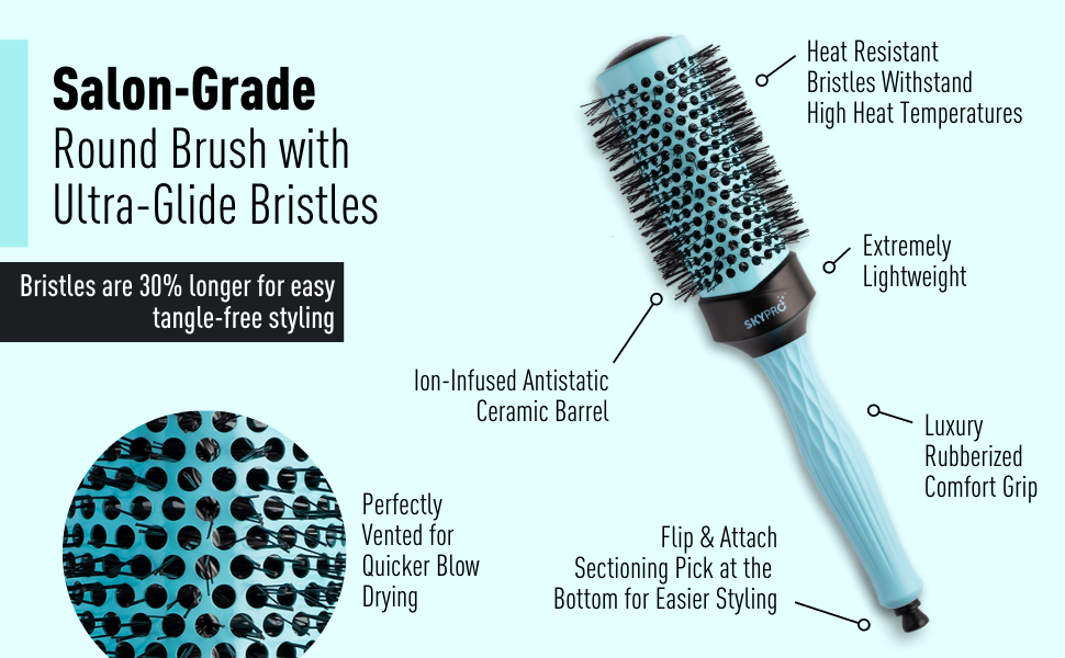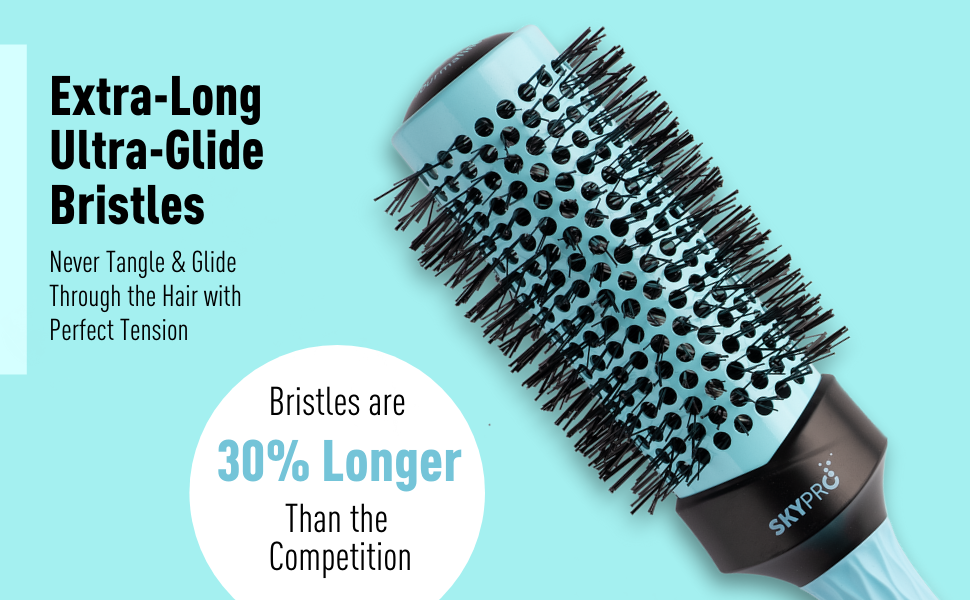 Every round hair brush part of the SKYPRO Professional Series has also been specially crafted with Ultra-Glide bristles that are 30% longer than the bristles of other circle roller brushes out there, allowing for a better tangle-free grip on the hair. While blow drying, this round brush never tangles and gently glides through the hair.