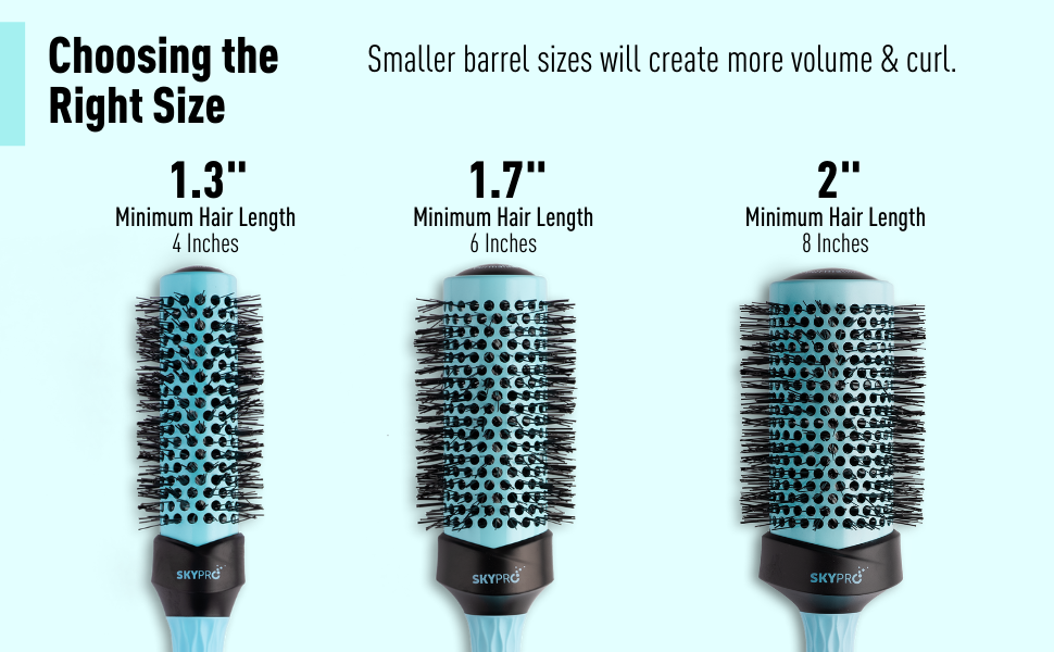 The 1.7 inch size is ideal for creating volume and a slight curl. This smaller brush size will create more curl, texture and volume in the hair than its 2 inch companion. Minimum hair length: 6 inches